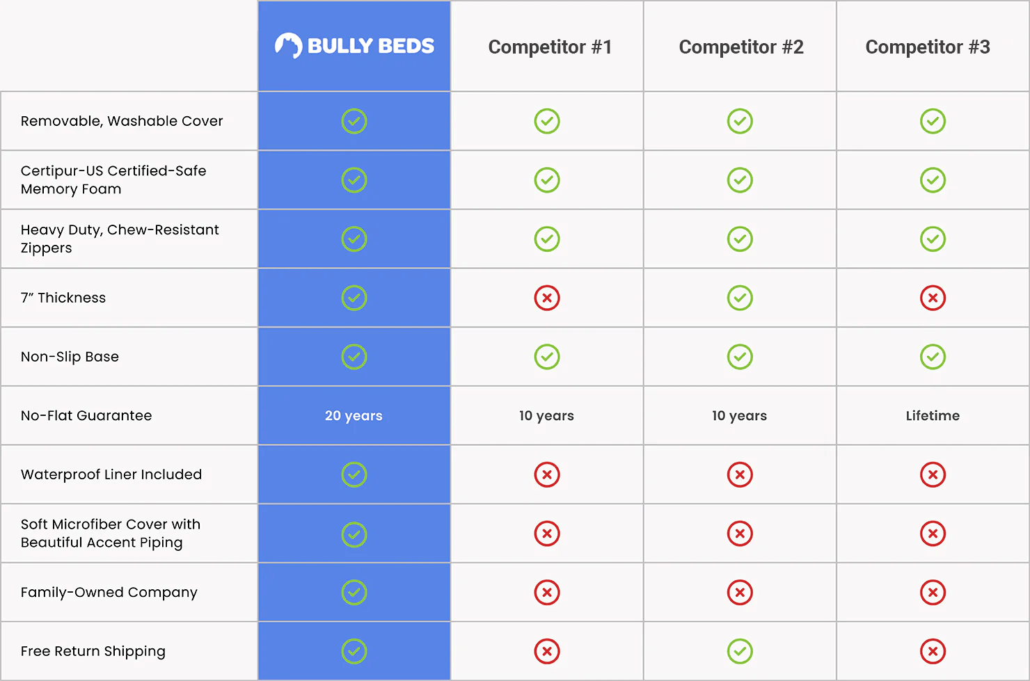 Bully Beds stands out as a top pet bed company because of our commitment to quality, durability, and pet health. Our beds are crafted with premium, non-hazardous materials, including high-density orthopedic memory foam that retains its shape over time. We focus on creating beds that are not only comfortable for pets but also practical for pet owners.